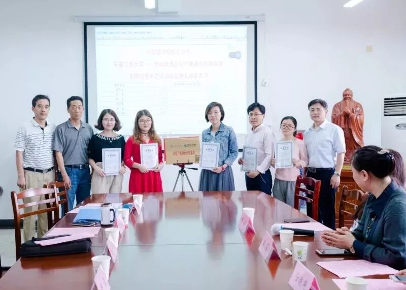 安徽工业大学葛芦生副校长,全国高校商务英语产教融合联盟理事会常务副理事长、北京全球语通教育科技有限公司企业战略总经理谷菲女士,全国高校商务英语产教融合联盟理事会秘书、全球语通研究院副院长张冰女士, 北京全球语通教育科技有限公司运营中心总监任铁艳女士,安徽工业大学外国语学院党委书记胡卫东,院长洪流,副院长黄宇弦,曹瑞斓,以及安徽工业大学外国语学院首期商务英语培训的全体学员出席了签约和揭牌仪式,仪式由安徽工业大学外国语学院副院长曹瑞斓教授主持。